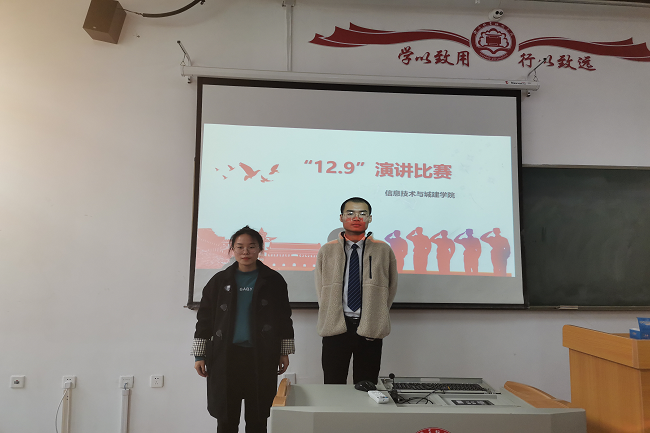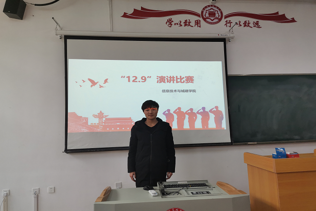 为继承和发扬爱国主义精神,纪念12.9学生爱国运动,使学生树立报效祖国的决心和振兴中华民族的远大志向,2019年12月6日下午13时,信息技术与城建学院在3号教学楼102教室举办了“勿忘国耻,振兴中华”的演讲比赛。
