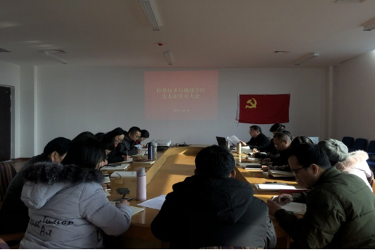 2019年12月12日下午,信息技术与城建学院党总支在伊滨区1号教学楼2楼党建活动室召开党总支全体党员大会,此次会议由我院党总支副书记付新典同志主持,全体党员教师参加。
