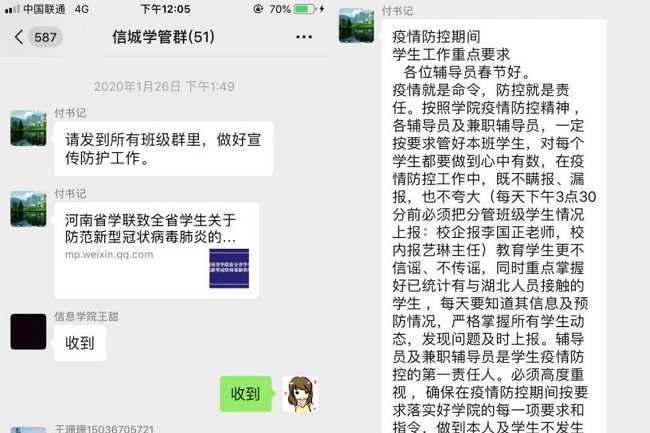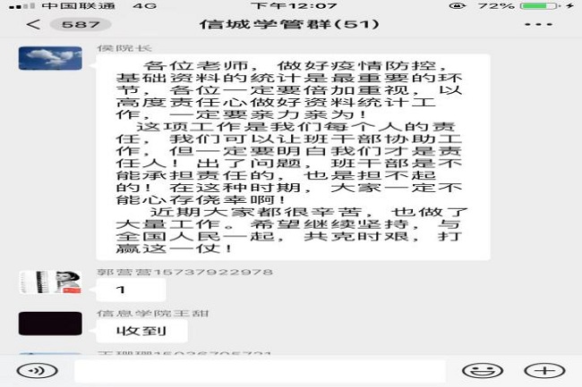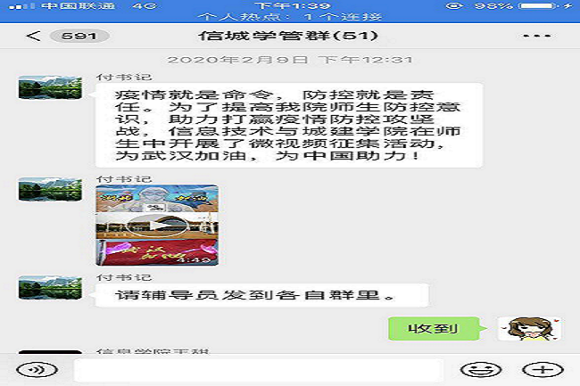自新型冠状病毒引起的肺炎疫情开始以来,疫情就是命令,防控就是责任,抗疫就是战斗!面对严峻的疫情防控形势,信息技术与城建学院学工队伍始终坚守在维护学生健康安全的第一线,学工团队上下联动,协调一致,共同抗击疫情,在特殊时期保障学生的身心健康!信息技术与城建学院全体学工人坚守工作一线,做到“电脑不关机、手机不离身”,以居家为战位,用手机抓战机,无论身在何处,工作始终在线。辅导员们建立各式各类学生微信群、qq群、组建“防疫工作”微信群,向每个班级、每个学生通报疫情态势和防控工作进展,积极开展疫情科学防控、自我防护等健康知识宣传,做到疫情防控通知人人知晓,疫情防控要求人人遵守,疫情防控知识人人知晓,疫情防控措施人人落实。为确保学生有效进行网络学习,辅导员们在统计汇报信息的同时,不忘监督学生网上学习,争取做到除特殊学生外,所有学生停课不停学。