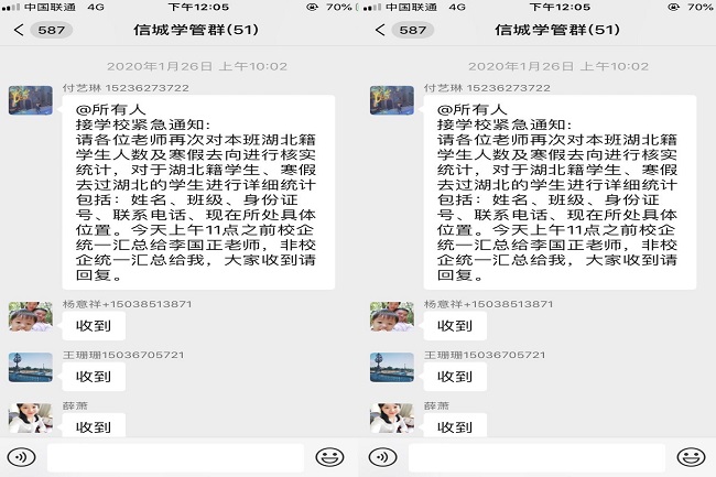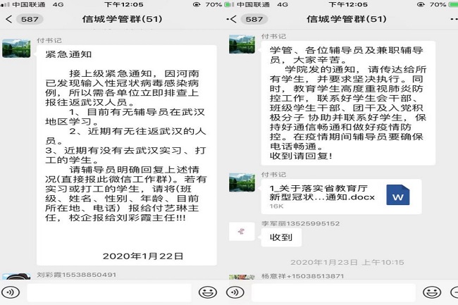 自新型冠状病毒引起的肺炎疫情开始以来,疫情就是命令,防控就是责任,抗疫就是战斗!面对严峻的疫情防控形势,信息技术与城建学院学工队伍始终坚守在维护学生健康安全的第一线,学工团队上下联动,协调一致,共同抗击疫情,在特殊时期保障学生的身心健康!信息技术与城建学院全体学工人坚守工作一线,做到“电脑不关机、手机不离身”,以居家为战位,用手机抓战机,无论身在何处,工作始终在线。辅导员们建立各式各类学生微信群、qq群、组建“防疫工作”微信群,向每个班级、每个学生通报疫情态势和防控工作进展,积极开展疫情科学防控、自我防护等健康知识宣传,做到疫情防控通知人人知晓,疫情防控要求人人遵守,疫情防控知识人人知晓,疫情防控措施人人落实。为确保学生有效进行网络学习,辅导员们在统计汇报信息的同时,不忘监督学生网上学习,争取做到除特殊学生外,所有学生停课不停学。