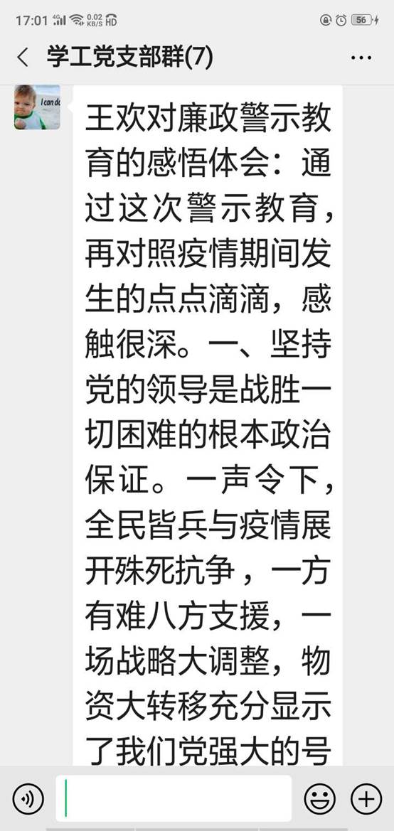 全体党员一致认为,警示教育要经常搞,廉洁重锤要不断敲。让警钟长鸣,促自警自醒,只有通过不断的提醒、警示,广大党员干部思想才能受到强烈的震撼,遵纪守法的观念和自觉接受监督的意识才能更强,筑牢拒变防变的思想道德防线,真正做到知敬畏、存戒惧、守底线。学工支部结合近期新冠肺炎疫情的学生各种信息报送工作与执行防疫指挥部的各种纪律、指令要求时,重点学习交流了在执纪守法教育中,严格落实规章制度是关键,做到令行禁止是底线,准确填报信息是职责,详细知道学生位置和分布是防控工作任务要求,要想打赢阻击战所有人员都必须高站位,重点明确,大局意识和全局观念强,各种防控措施和统筹开学复学工作必须严细实,坚决杜绝推诿扯皮、敷衍塞责等形式主义官僚主义发生。只有这样,才能克服“宗旨意识不强,不尽责、不担当、不作为,纪律松弛”等现象,才能确保坚决执行上级决策部署和疫情防控工作不失职渎职、玩忽职守,才能做到不漏报、不满报、不迟报,确保信息准确到位。同时,总支还利用学院微信群、网站及电话等平台在全体教师中进行了传达学习、讨论、交流,并要求全体教师既要认真学习纪委编发的《“疫”案促改警示教育典型案列选编》,通过“疫”案的典型案列,入脑入心受教育、受洗礼,达到了人人在疫情面前受教育的目的,明确了方向和职责,确保了教育的效果,人人写了心得体会。