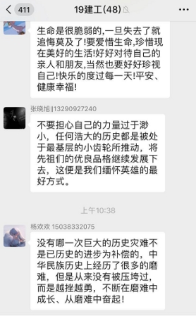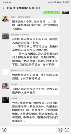 此次悼念活动使广大师生更深刻的认识到“爱国、奉献”的精神内涵,进一步增强了大家的“责任与担当”意识。大家纷纷表示要向英雄学习,不忘初心、砥砺前行,珍惜时光、奋发图强,铭记历史、刻苦学习,为实现中华民族伟大复兴的中国梦而奉献自己的青春力量。