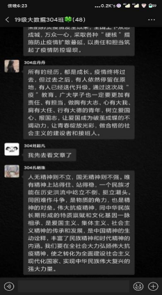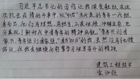 学院广大学子认真学习领会习近平总书记给北京大学援鄂医疗队全体“90后”党员的回信并以“说、倡、拍、思、行”不同的形式展现青春担当,以青春之名写下战疫宣言,立志在为人民服务中茁壮成长,在艰苦奋斗中砥砺意志品质,在实践中增长工作本领,争做堪当大任的时代新人,让青春在党和人民最需要的地方绽放绚丽之花。