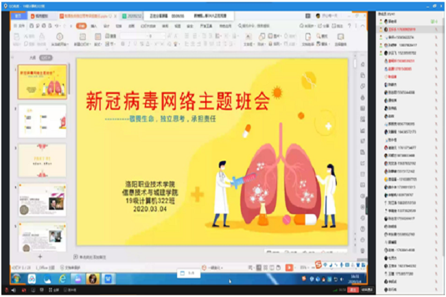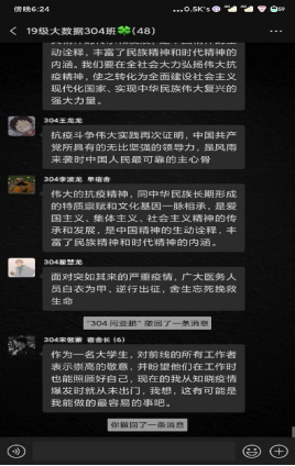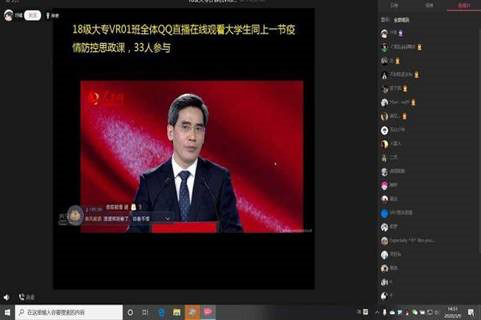 信息技术与城建学院的辅导员紧紧围绕落实立德树人根本任务,充分利用疫情这个特殊教材,努力化疫情危机为教育契机,通过qq群、微信群、钉钉、抖音直播等形式开展线上主题班会。辅导员们充分运用疫情这个特殊教材向学生或讲述、或播放视频,让学生了解抗疫一线一个个“平凡英雄”的感人故事,用真人真事教育引导学生,引导学生在困难和危机面前,与人民共命运、和时代同步伐。