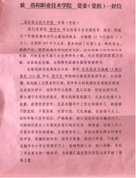 5月28日,学校党委书记朱美荣收到了一封真挚的感谢信,这封信来自中共双龙镇委员会。信中双龙镇党委政府对我校信息技术与城建学院19级大专计算机314班的程守印同学在新冠肺炎疫情防控时期为家乡抗疫工作所做的贡献进行表扬,并对我校的悉心培养表示感谢与赞扬。朱书记在收到感谢信后作出批示,要求宣传统战部、学生处、信息技术与城建学院对程守印同学的表现进行宣传并表扬,号召全体学生学习程守印同学勇于担当、无私奉献的精神。