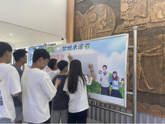 在医学院讲解同学的带领下,同学们有序参观了胚胎孕育展厅、呼吸系统展厅、消化系统展厅和护理应用展厅,讲解了相关健康知识,直观看到了吸烟前后肺部标本的对比,真切感受到抽烟之可怕,生命之珍贵。最后,同学们纷纷在禁烟承诺书上签下自己的名字,纷纷表示要关注生命健康,摒弃吸烟陋习。