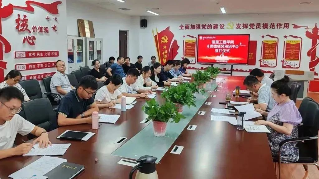 教师是立教之本,师德是教育之魂,为更好落实立德树人根本任务,加强师德师风建设,激励我院教职工以高尚的师德和全新的精神面貌开启新学期教育教学工作。9月21日下午,信息工程学院于3-210会议室举办了《师德师风承诺书》签订仪式,全体教职工参加了签订仪式。