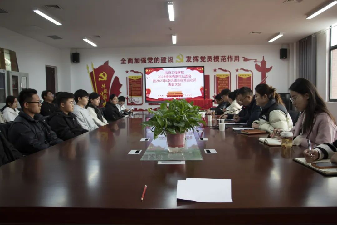 11月15日中午,信息工程学院在3-210会议室召开2023级优秀新生见面会暨2023年秋季运动会优秀运动员表彰大会,信息工程学院院长夏文新、党总支书记马选宝、党总支副书记马侨丹、全体专职辅导员、2023级优秀新生代表和2023年秋季运动会优秀运动员代表参加会议。会议由团总支书记万维思主持。