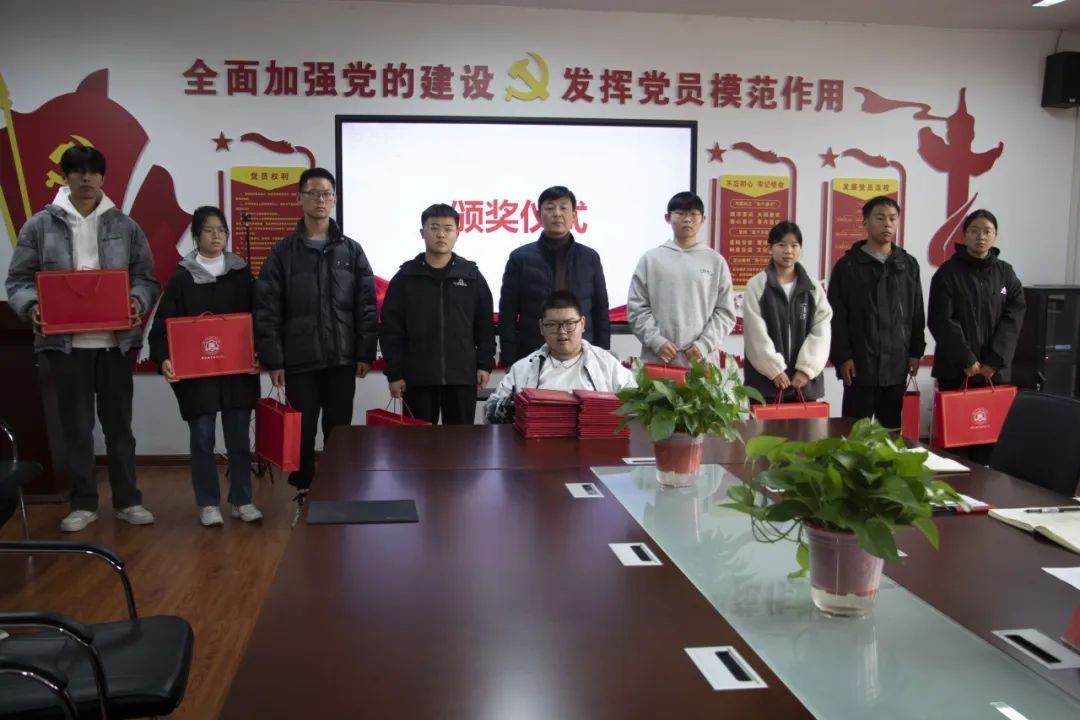 两位优秀代表发言完毕后,夏文新、马选宝为优秀新生代表和优秀运动员代表颁发奖品并合影留念。