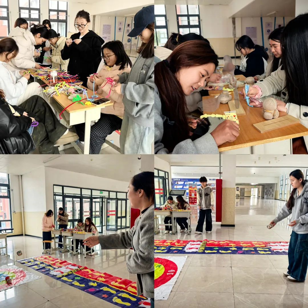 在三号楼大厅,学生会心理部举办女神的手巧工坊、镜中花影、手忙脚乱挑战赛、心灵投射投靶游戏等一系列活动,同学们热情参与,现场气氛热烈。