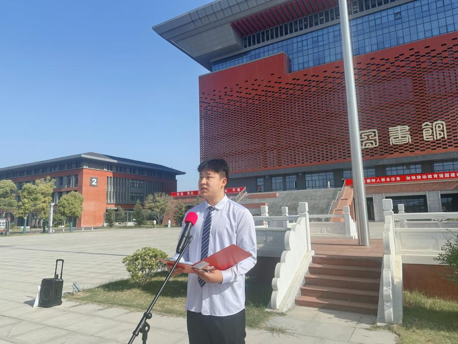 在国旗下,学生代表23计算机302班余付乾以《以青春之名,逐时代之光》为主题进行发言,他号召同学们继承先辈遗志,在新时代征程中勇担重任。并结合国家 “体重管理三年行动” 政策,呼吁同学们既要追求卓越的专业技能,更要锤炼强健体魄,将个人成长融入国家发展大局。