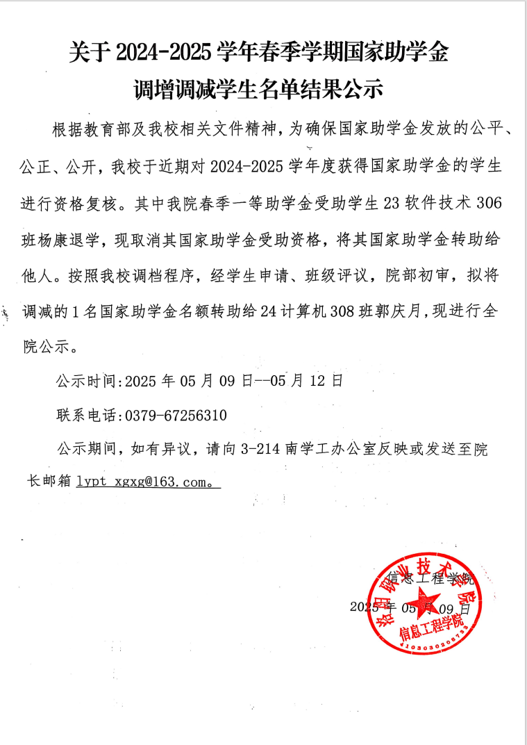 关于2024-2025学年春季学期国家助学金调增调减学生名单结果公示