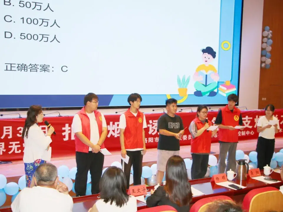 为了加强烟草危害和控烟政策宣传,维护人民群众健康,加大控烟宣传和健康教育工作力度,推进洛阳职业技术学院控烟工作深入开展,进一步推进无烟学校建设,保护青年师生的身体健康,5月29日下午,第38个世界无烟日主题宣传活动在学校大学生活动中心一楼报告厅成功举办。洛阳市疾控局局长、市卫生健康委党组成员、副主任刘龙庄,洛阳职业技术学院副校长张志友,洛阳市疾病预防控制中心党委副书记龚勋,洛职学生中心、信息工程学院、校医院负责人,二级学院党总支副书记和学工办主任及学生代表近300名师生代表参加。活动通过“知识科普+互动体验”的形式,使青年师生内化于心、外化于行,自觉筑牢无烟校园防线。