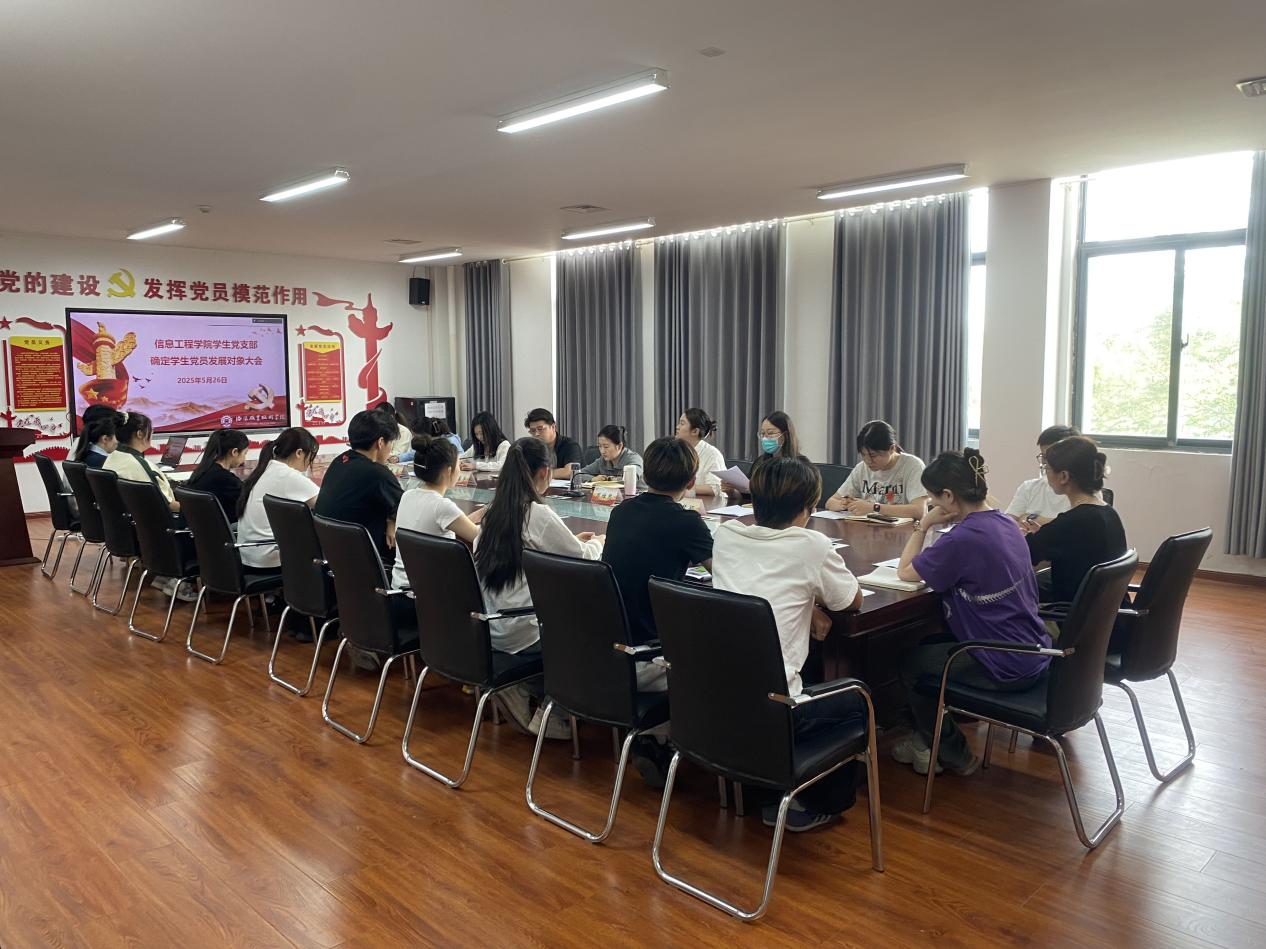 为规范党员发展程序,加强基层党组织建设,信息工程学院学生党支部于2025年5月26日在3-210会议室召开确定发展对象接收大会,讨论并表决蒋明翰等43名入党积极分子是否确定为党员发展对象。会议由赵梦颖同志主持,支部全体党员、培养联系人及23级学生入党积极分子参加会议。