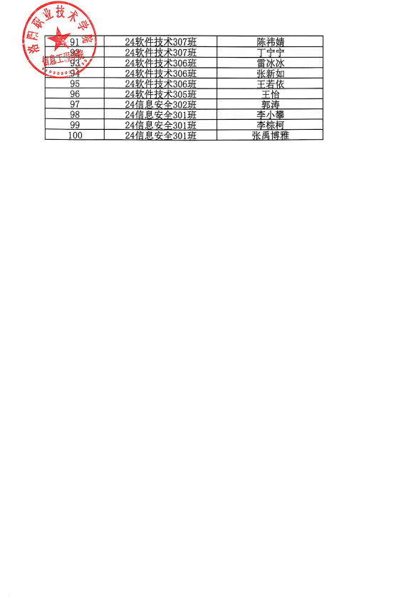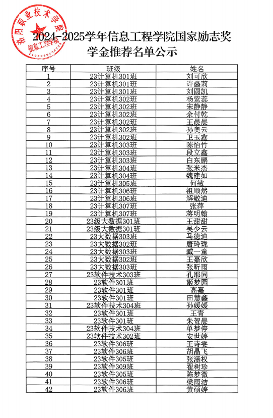 根据洛阳职业技术学院学生资助管理中心安排部署的《关于做好2024-2025学年国家励志奖学金评定工作的通知》工作安排及分配名额,经学院评议,信息工程学院共6人获得学院国家奖学金。现将信息工程学院2024-2025学年学校奖学金获得者予以公示,请大家监督。