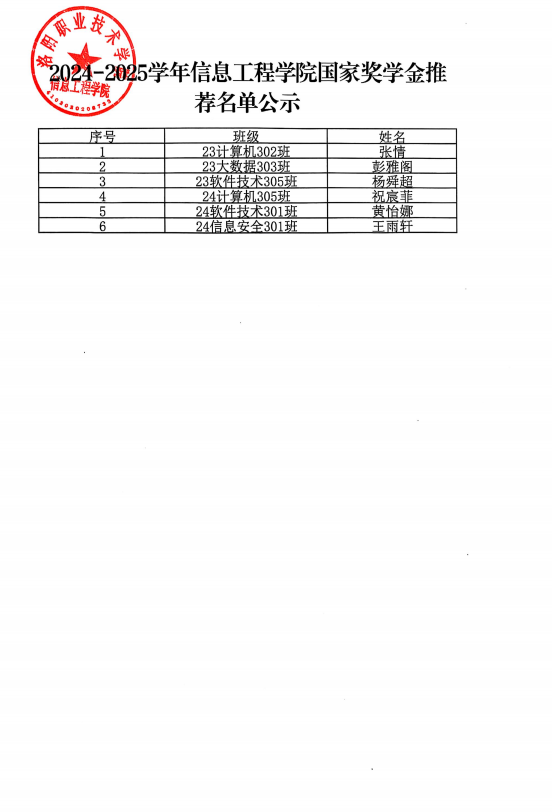 根据洛阳职业技术学院学生资助管理中心安排部署的《关于做好2024-2025学年国家奖学金评定工作的通知》工作安排及分配名额,经学院评议,信息工程学院共6人获得学院国家奖学金。现将信息工程学院2024-2025学年学校奖学金获得者予以公示,请大家监督。