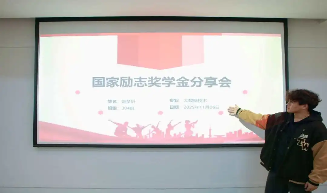24大数据305班蒋曙宇,他用真实经历讲述成长故事,为25级学生分享自己成长的经验,认为应该把个人理想扎进现实土壤,青春才能结出有分量的果实,传递了青春奋斗的理念。