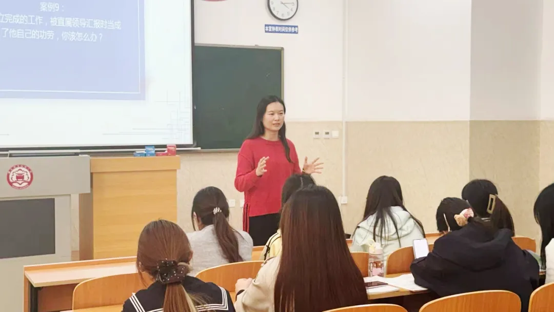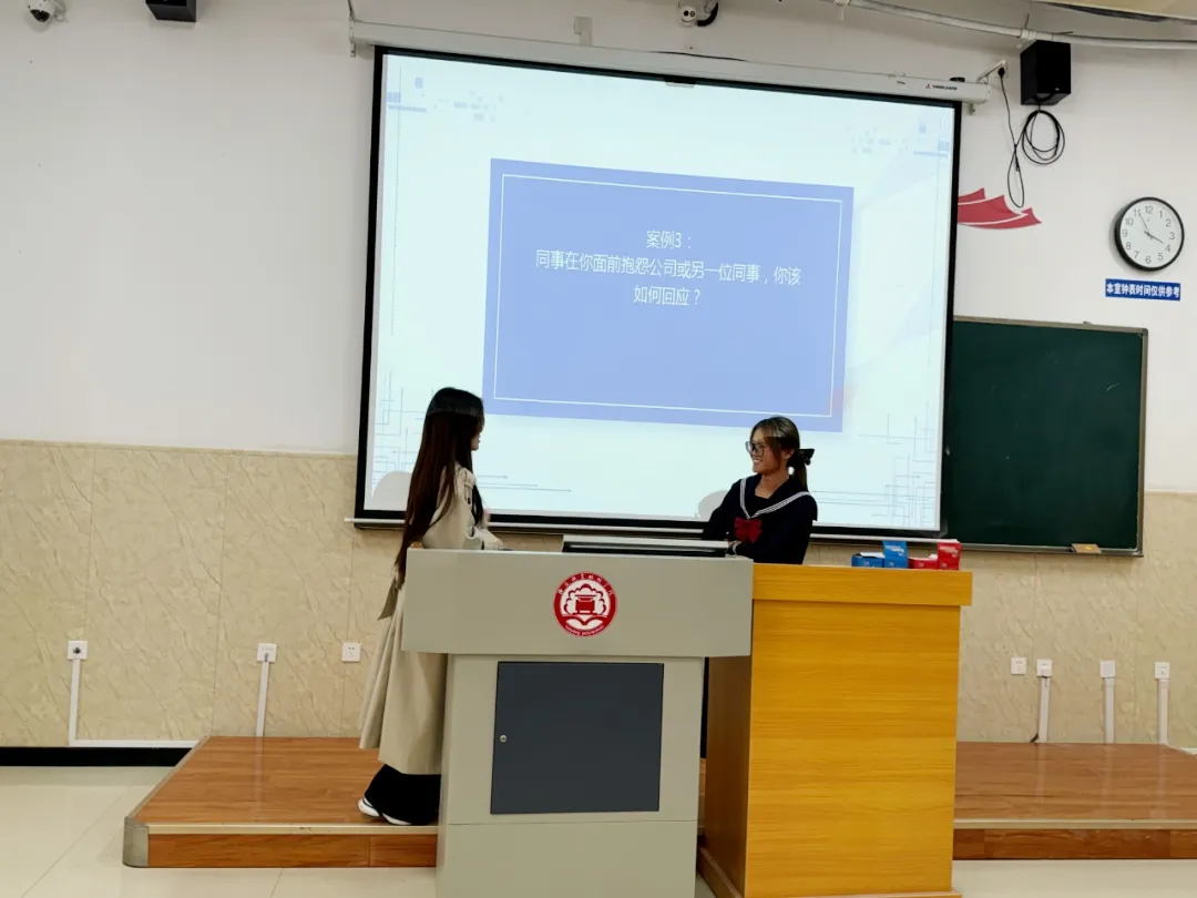 活动现场,同学们化身职场角色,以生动鲜活的情景剧形式,将一个个棘手的沟通难题真实还原。情景剧演绎结束后,活动进入高潮环节——“思辨交锋”。“判官”们各抒己见:有人认为坚守原则和底线是根本,有人强调灵活变通与维系和谐同样关键。指导老师进行点评引导,帮助同学们拨开迷雾,探寻现象背后的逻辑与应对之道。