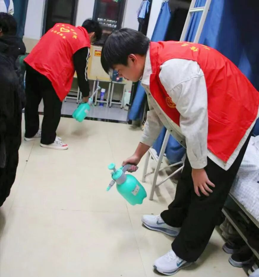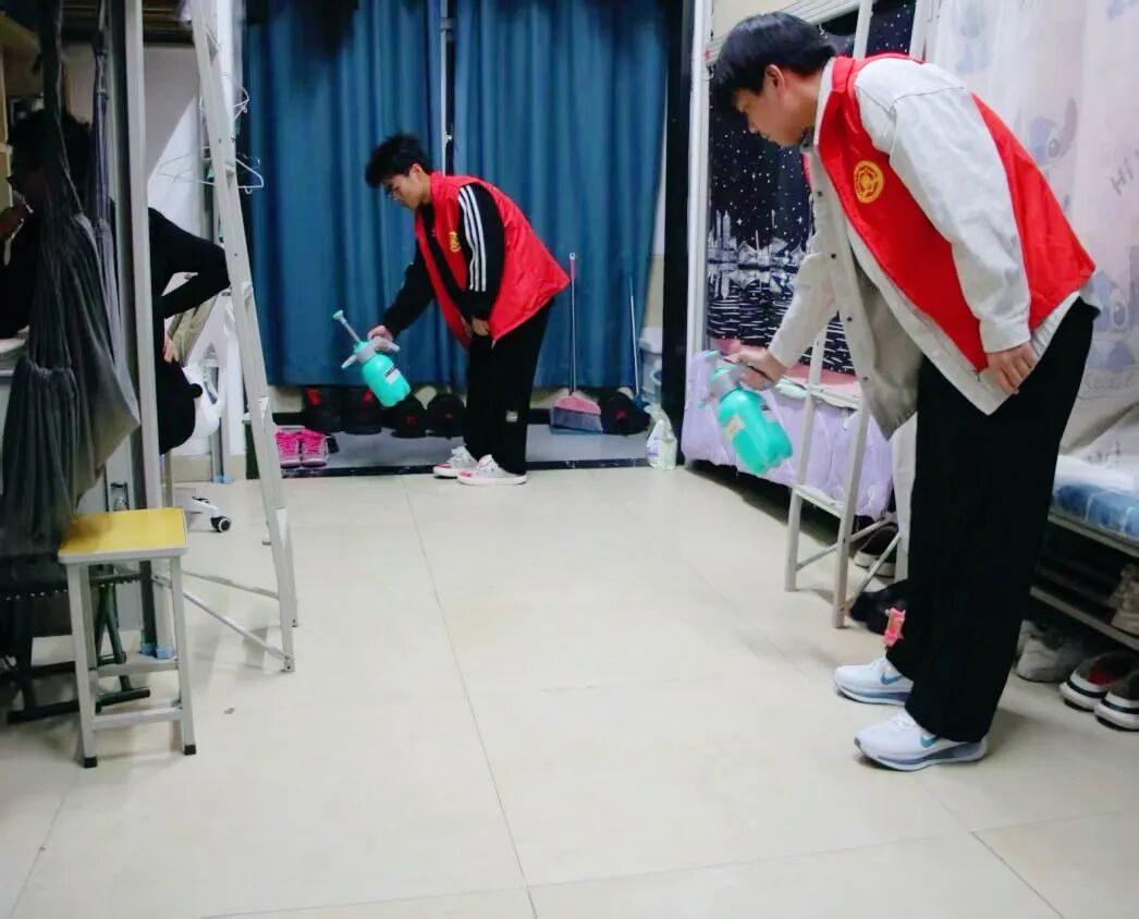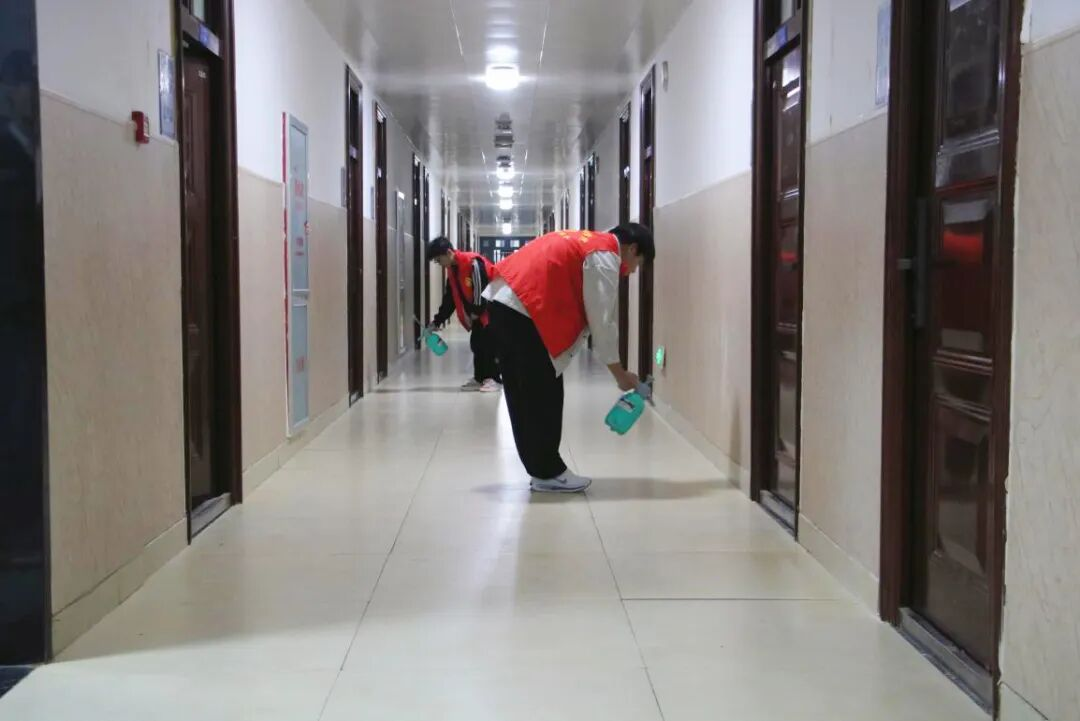 在宿舍楼内,工作小组采取“逐楼推进、逐层覆盖”的方式开展消杀作业:工作人员和志愿者对楼梯扶手、门把手、消防栓按钮等细节部位反复喷洒消毒,清理楼道堆积杂物,提醒宿舍同学在消杀期间暂时关闭门窗,待消杀完成通风后再进入。不少老师也主动加入,走进学生宿舍,与同学们一同整理内务、清洁桌面,检查宿舍卫生死角,现场讲解“勤洗手、常通风、少聚集”的防流小知识,用实际行动带动学生养成良好生活习惯。参与活动的学生表示:“看到老师和志愿者们认真消杀,还手把手教我们消毒技巧,感觉特别安心,以后也会每天做好宿舍清洁,和大家一起守护‘小家’健康。”