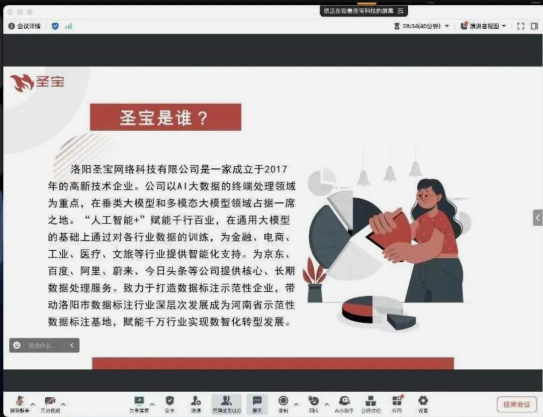 洛阳圣宝网络科技有限公司宣讲负责人详细介绍公司发展历程、业务布局及企业文化。作为成立于2017 年的高新技术企业,圣宝科技深耕 AI 大数据终端处理领域,在垂类大模型和多模态大模型领域具备核心竞争力,为京东、百度、阿里等知名企业提供长期数据处理服务。本次重点推出人工智能(AI)训练岗位,计划招聘50 人,岗位内容贴合行业前沿需求,为学生提供从理论到实践的成长通道。