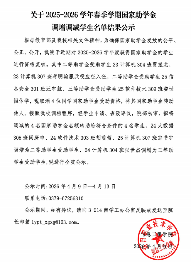 关于2025-2026学年春季学期国家助学金调增调减学生名单结果公示
