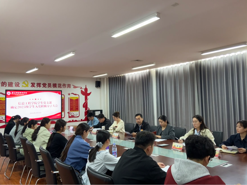 为严格规范党员发展工作流程,严把党员队伍“入口关”,充实学生党支部后备力量,加强青年学生思想政治建设,2026年4月22日下午,信息工程学院学生党支部在3-210会议室召开2025级学生入党积极分子确定大会。学生党支部全体党员、48名拟确定入党积极分子、2025级辅导员及班主任代表参加会议。